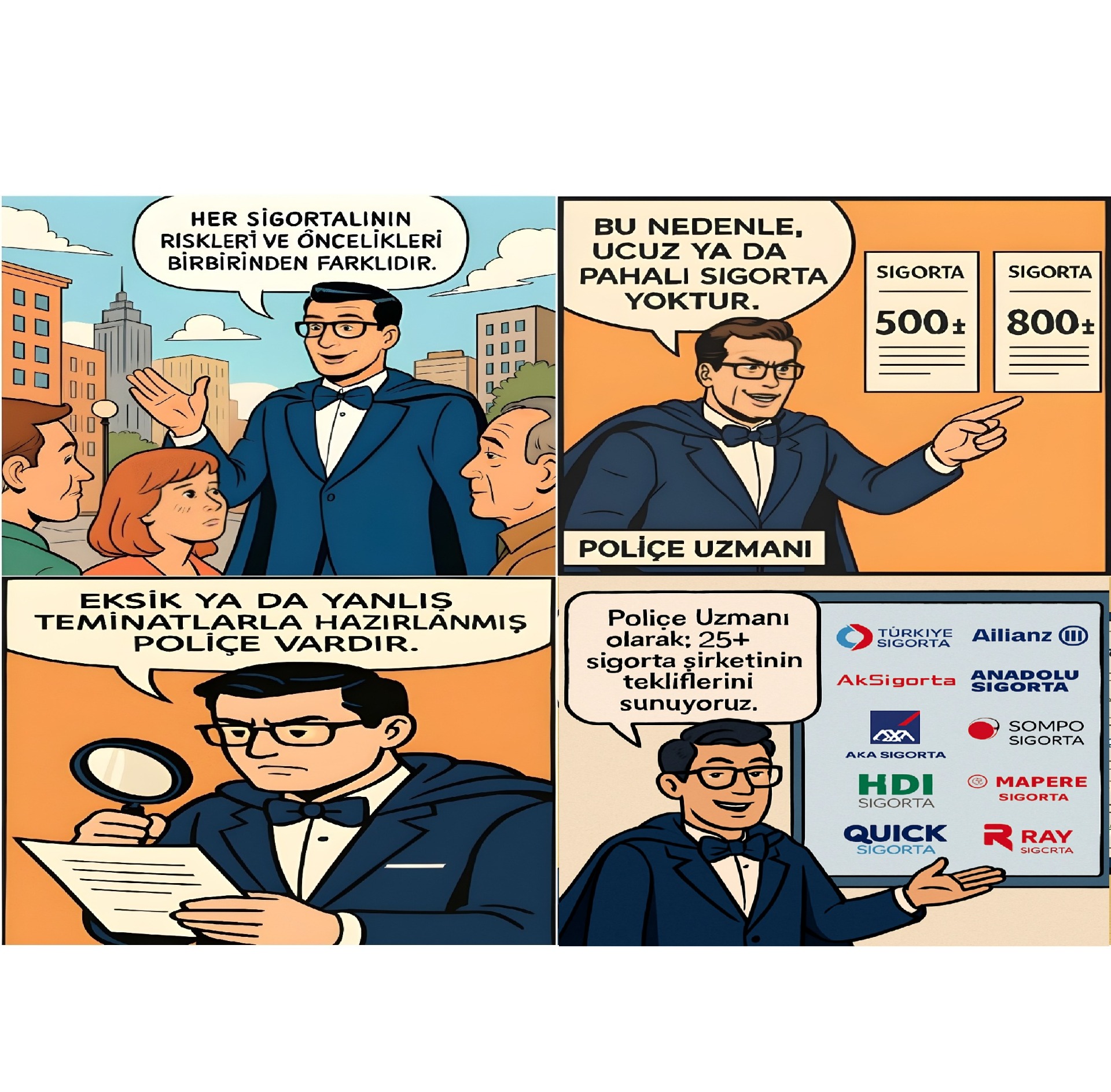Poliçe Uzmanı olarak, sigorta teklif ve sigorta poliçelerinizi hazırlarken sizlerin bizimle paylaştığı bilgiler çerçevesinde; risk, ihtiyaç, beklenti ve taleplerinize uygun sigorta tekliflerini hazırlar ve sigorta poliçelerinizi oluştururuz.